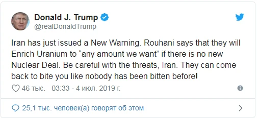 "Iran vừa đưa ra cảnh báo mới. Rouhani nói rằng họ sẽ tăng mức độ làm giàu hạt nhân Uranium đến khi nào họ muốn nếu không có thỏa thuận hạt nhân mới. Hãy cẩn thận với các mối đe dọa, Iran. Họ có thể quay lại cắn bạn " - Ông Trump viết trên trang cá nhân Twitter.