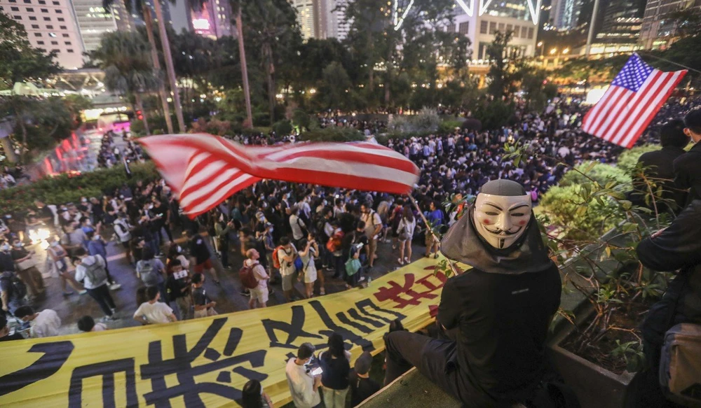 Người biểu tình Hong Kong cầm cờ Mỹ. Ảnh: SCMP