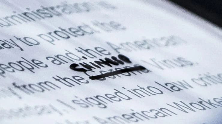 Những bức ảnh chụp tờ giấy in phát biểu mà ông Trump đưa ra từ đầu cuộc họp báo cho thấy ai đó có chữ viết tay tương tự như của ông Trump đã gạch bỏ từ “Corona” và viết từ “Trung Quốc” bên trên.
