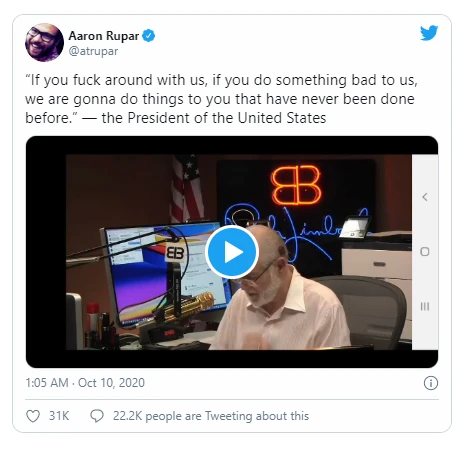 Tổng thống Donald Trump đã đe dọa Iran bằng giọng điệu vô cùng cứng rắn trong cuộc trả lời phỏng vấn ngày 9-10. Ảnh: TWITTER
