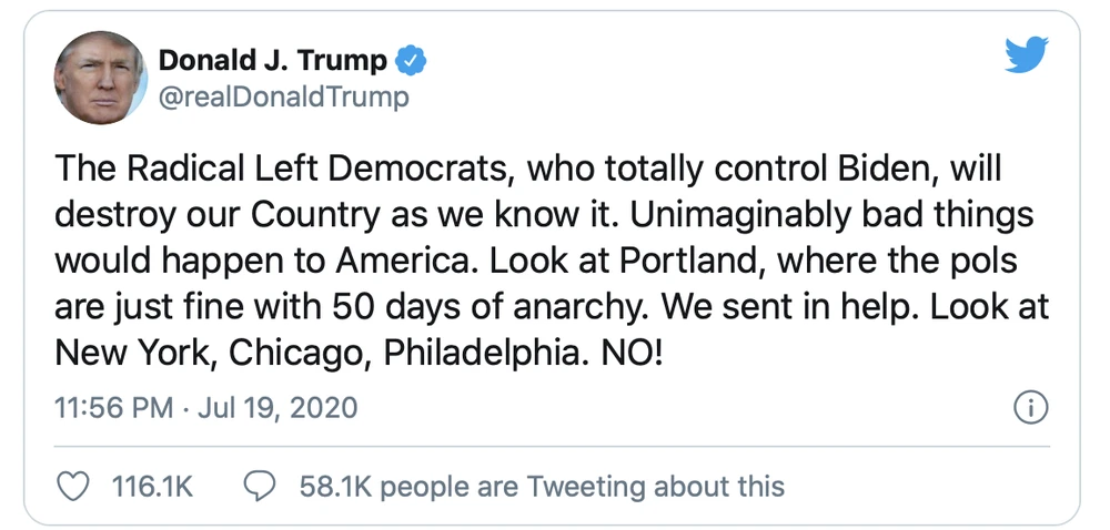 Trong một dòng tweet gần đây, ông Trump cáo buộc ông Biden chịu kiểm soát của phe cánh tả cực đoan - tức các lãnh đạo của TP Portland, thuộc bang Oregon, nơi phong trào Black Lives Matter và nhóm bạo loạn Antifa đã đập phá và đốt cháy Trung tâm Tư pháp của thành phố này trong hơn 50 ngày.