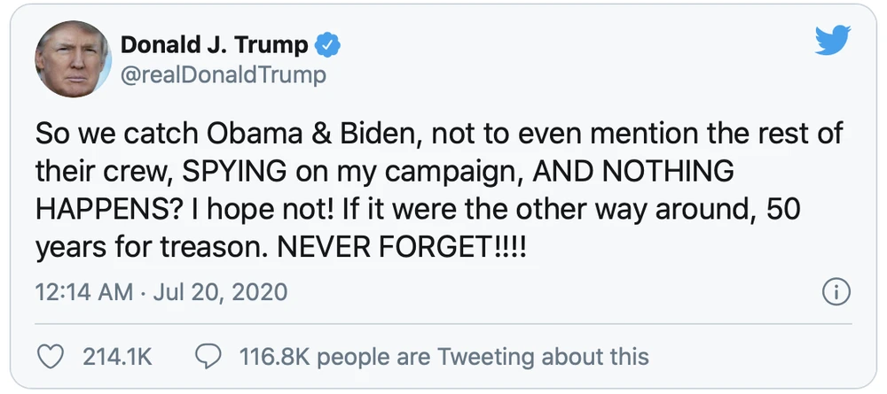 Trong bài đăng trên Twitter, ông Trump bày tỏ hy vọng sẽ không có gì xảy ra sau khi có người do thám kế hoạch tranh cử của ông. Ông cảm thấy “50 năm tù tội phản quốc” dành cho ông Obama và ông Biden là xứng đáng.