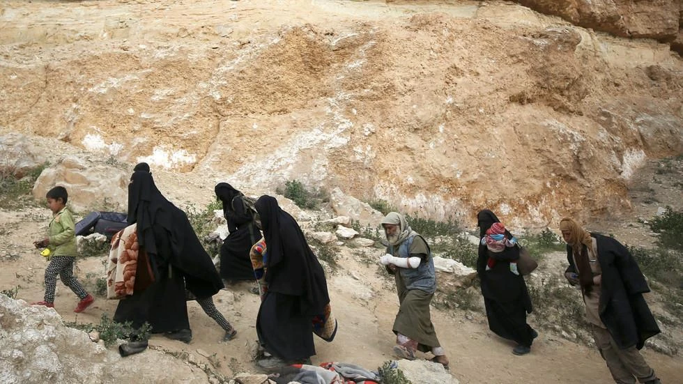 Các tay súng IS cùng phụ nữ và trẻ em rời khỏi làng Baghouz, tỉnh Deir Al Zor, Syria. Ảnh: REUTERS