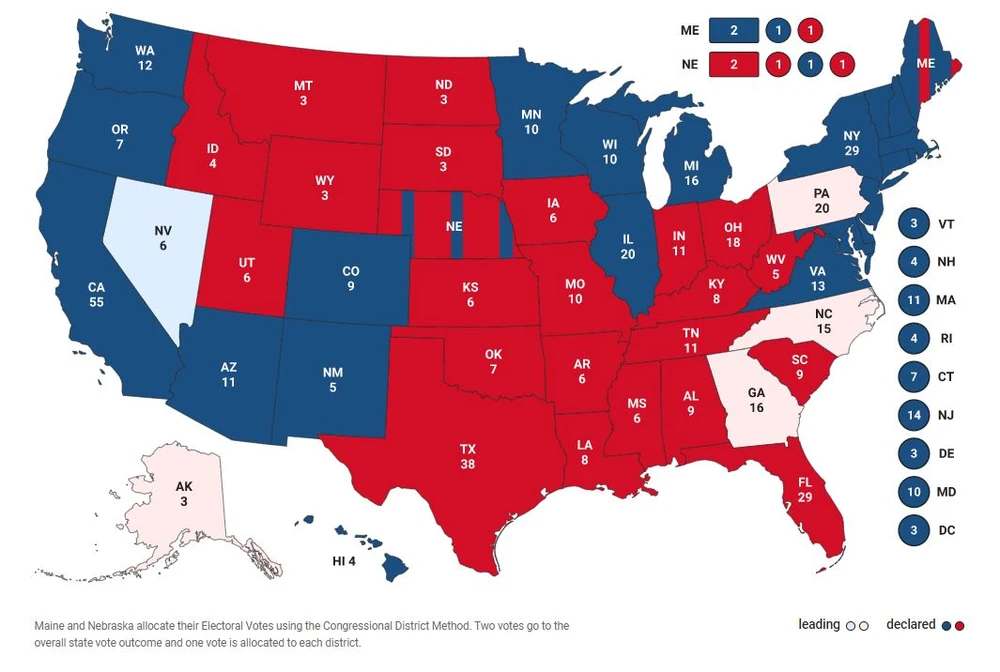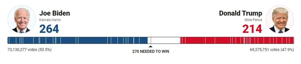 Hiện ông Biden vẫn đang dẫn trước về cả số phiếu đại cử tri lẫn số phiếu phổ thông, lần lượt là 264 và hơn 73 triệu, so với 214 và hơn 69 triệu của ông Trump.