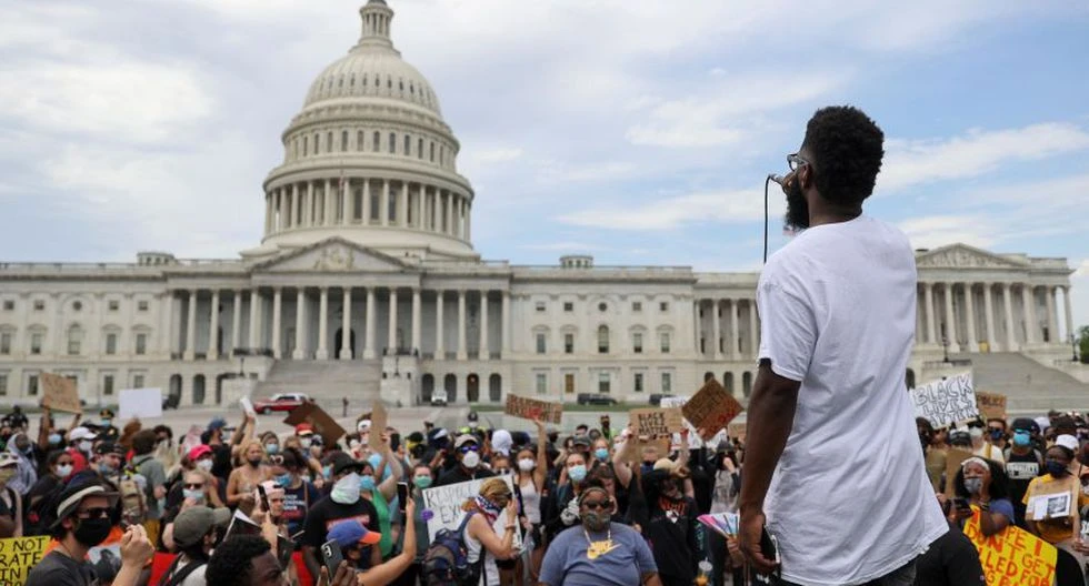 Một người ủng hộ phong trào chống phân biệt chủng tộc dẫn đầu một cuộc biểu tình bên ngoài toà nhà Quốc hội Mỹ tại Washington DC. Ảnh: REUTERS