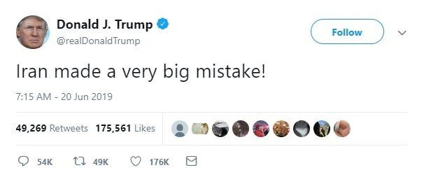 Twitter sáng này 20-6, ông Trump gọi hành động bắn hạ máy bay của Mỹ là phạm sai lầm lớn. Ảnh: Twitter
