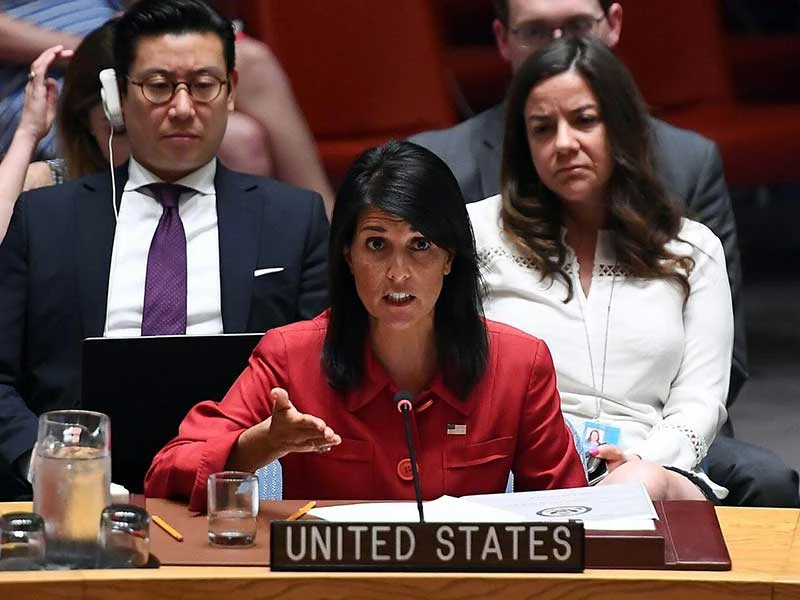 Đại sứ Mỹ tại LHQ Nikki Haley khẳng định Mỹ sẽ không bao giờ tin tưởng Nga. Ảnh: AFP