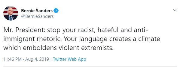Thượng nghị sĩ Bernie Sanders cũng nói rằng: "Tổng thống: Hãy ngăn chặn sự phân biệt chủng tộc, đáng ghét và chống nhập cư của ông. Ngôn ngữ của ông tạo ra một bầu không khí khắc chế những kẻ cực đoan bạo lực".