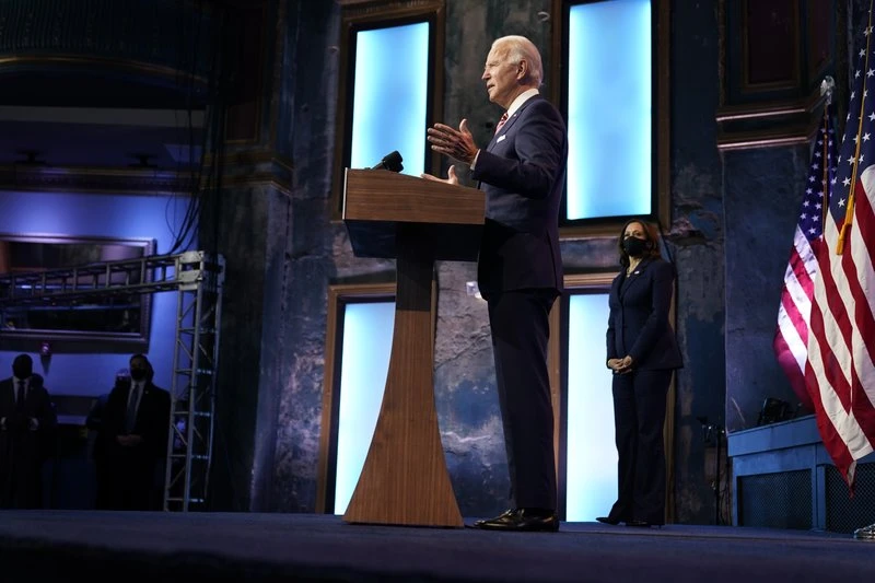 Ứng viên Dân chủ Joe Biden – người được truyền thông Mỹ xác định là tổng thống đắc cử sau cuộc bầu cử ngày 3-11, dựa vào thống kê kết quả kiểm phiếu – phát biểu về nội dung khôi phục kinh tế, tại TP Wilmington, bang Delaware (Mỹ) ngày 16-11. Ảnh: AP