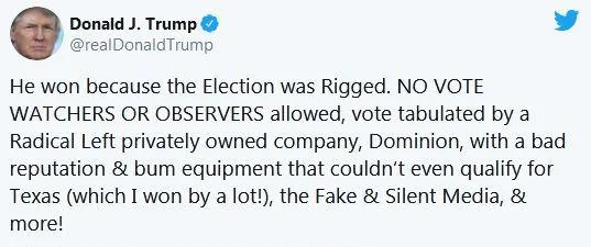 "Ông ấy đã thắng vì cuộc bầu cử đã bị can thiệp. Không có người theo dõi hay giám sát, phiếu bầu được xử lý bởi một công ty tư nhân do cánh tả sở hữu có tên Dominion, với tai tiếng và thiết bị kém chất lượng không đạt chuẩn ngay cả ở Texas (nơi tôi đã thắng lớn)" - Trump đăng trên Twitter sáng 15-11.