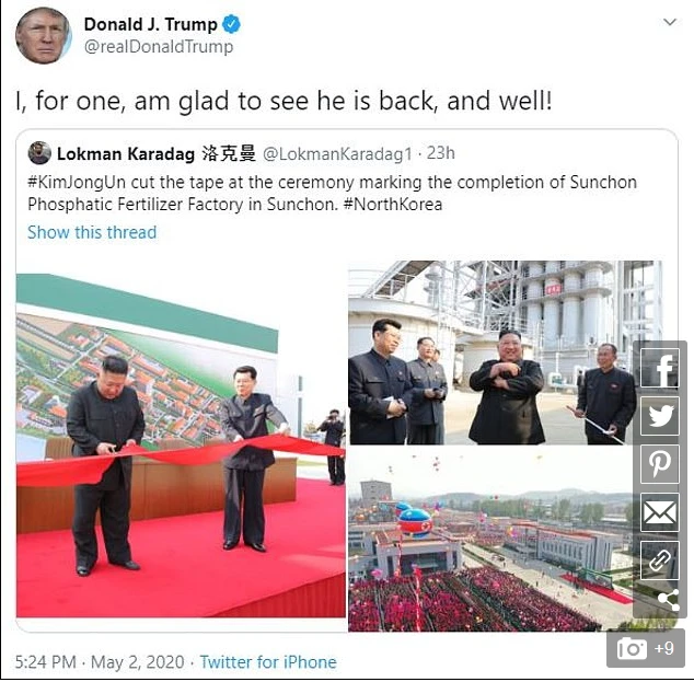 Ông Trump đăng kèm những hình ảnh cho thấy ông Kim xuất hiện tại nhà máy phân bón gần thủ đô Bình Nhưỡng. Ảnh: TWITTER
