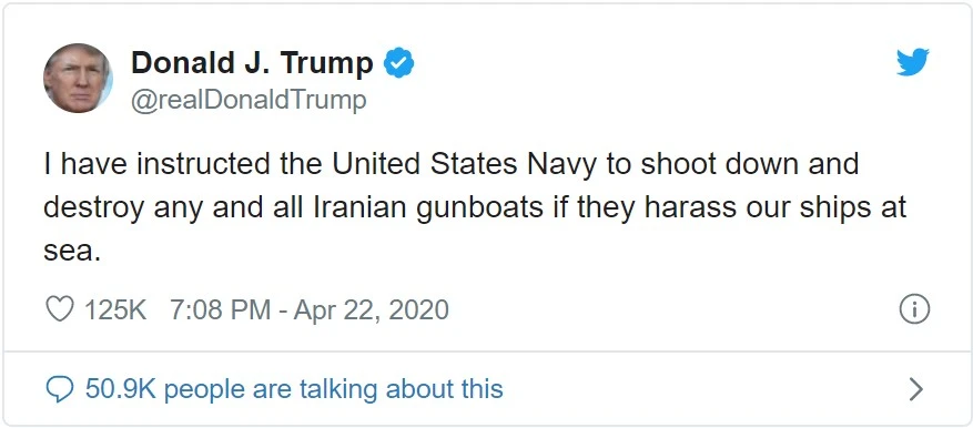 Sáng 22-4 (theo giờ Mỹ), Tổng thống Trump viết trên Twitter rằng: "Tôi đã chỉ thị cho Hải quân Mỹ bắn hạ và tiêu diệt bất kỳ hoặc tất cả tàu pháo Iran nếu chúng quấy rầy tàu chúng tôi trên biển".