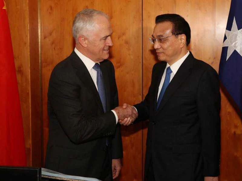 Thủ tướng Úc Malcolm Turnbull (trái) bắt tay người đồng cấp Trung Quốc Lý Khắc Cường (phải). Ảnh: SMH