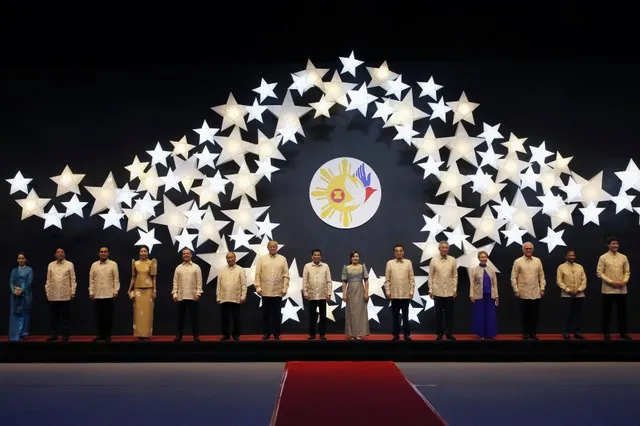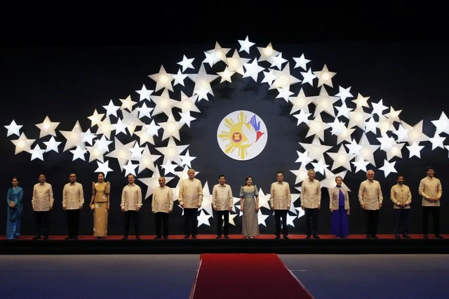 Lãnh đạo của 10 nước thành viên ASEAN cùng khách mời chụp ảnh lưu niệm tại đêm tiệc. Ảnh: Reuters