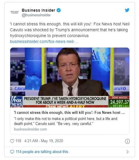 "Nếu bạn đang phải sống trong mối lo như nước Mỹ và bạn coi loại thuốc này là một phương pháp điều trị phòng ngừa COVID-19 thì nó có thể sẽ giết chết bạn đấy" - ông Cavuto nói.
