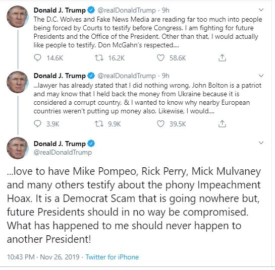 “Tôi rất muốn Ngoại trưởng Mike Pompeo, Bộ trưởng Năng lượng Rick Perry và quyền Chánh văn phòng Nhà Trắng Mick Mulvaney và nhiều người khác ra làm chứng về những vấn đề liên quan đến việc chơi khăm thông qua điều tra cuộc gọi”.