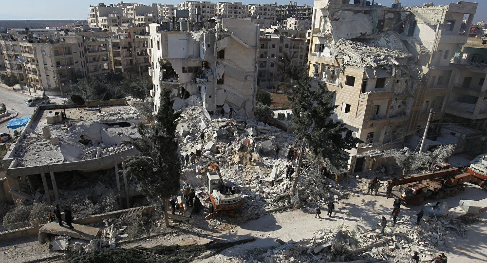 Một địa điểm bị không kích tại TP Idlib, Syria vào ngày 7-2. Ảnh: SPUTNIK