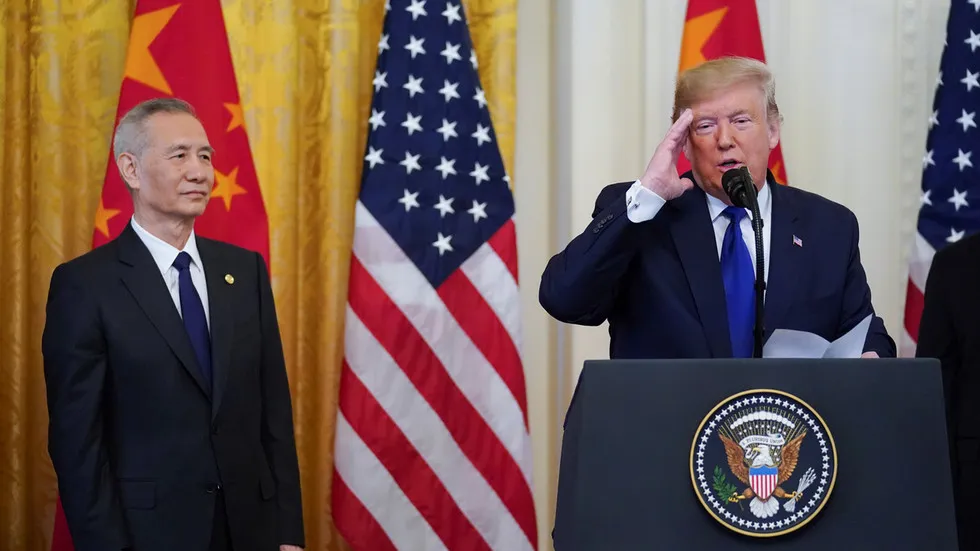 Tổng thống Mỹ Donald Trump (phải) và Phó Thủ tướng Trung Quốc Lưu Hạc tại lễ ký thỏa thuận thương mại Mỹ-Trung giai đoạn một hồi tháng 1-2020. Ảnh: Kevin Lamarque/REUTERS