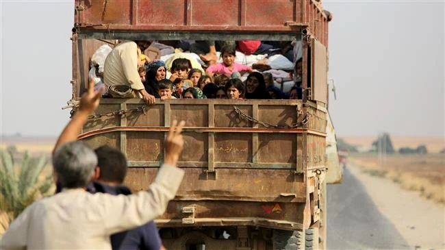 Dân thường người Kurd ở Kobani, Syria, gần biên giới Thổ Nhĩ Kỳ di tản ngày 16-10. Ảnh: AFP