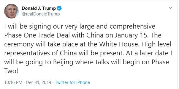 Twitter của Tổng thống Donald Trump nói về việc Thỏa thuận thương mại Mỹ-Trung giai đoạn một sẽ được ký kết vào ngày 15-1 tới. Ảnh: TWITTER
