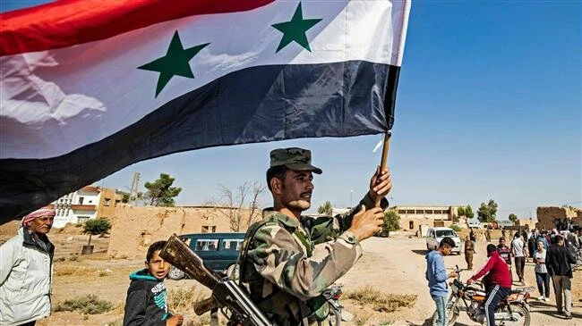 Binh sĩ quân đội Syria vẫy cờ quốc gia ở thị trấn Tel Tamer, đông bắc Syria. Ảnh: AFP