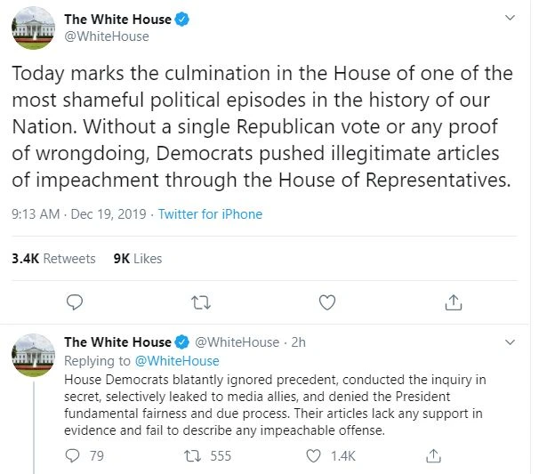 Trên trang Twitter của mình, Nhà Trắng nói rằng: "Hôm nay đánh dấu một chương lịch sử chính trị đáng xấu hổ nhất của Hạ viện. Không có một phiếu bầu nào từ đảng Cộng hòa hoặc bất kỳ bằng chứng nào về những việc làm sai trái, đảng Dân chủ đã đẩy các điều khoản luận tội bất hợp pháp thông qua Hạ viện.