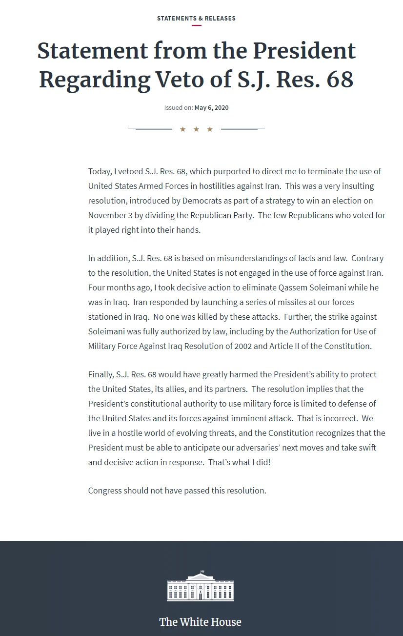 Theo đó, "Mỹ không tham gia vào việc sử dụng quân đội chống lại Iran" vì vụ tấn công hạ sát Thiếu tướng Qassem Soleimani (của Quân đoàn Vệ binh cách mạng Hồi giáo Iran) diễn ra trên lãnh thổ Iraq. Do đó, hành động này phù hợp với luật pháp Mỹ về quyền sử dụng quân đội ở Iraq (đã được thông qua năm 2002).