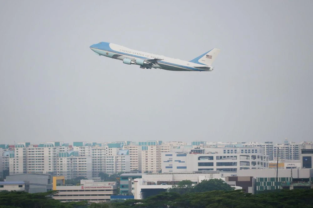 Hình ảnh cho thấy chiếc Không lực Một, chở Tổng thống Mỹ Donald Trump đã cất cánh khỏi sân bay căn cứ quân sự Paya Lebar, Singapore. Ảnh: ST