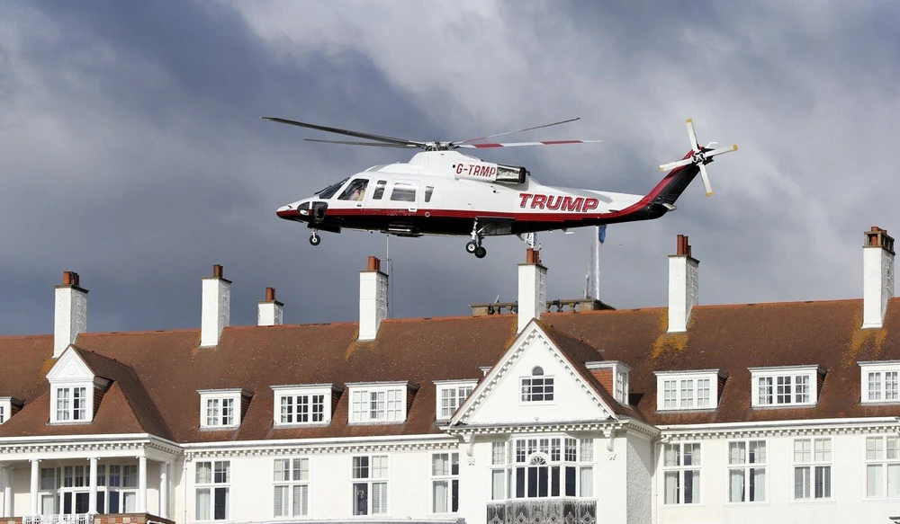 Một chiếc trực thăng do Tổng thống Trump sở hữu khởi hành từ sân golf Turnberry ở Scotland vào tháng 7-2015. Ảnh: AP