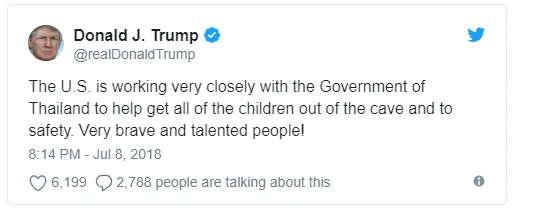 Tổng thống Mỹ Donald Trump viết trên Twitter: “Mỹ đang hợp tác chặt chẽ với chính phủ Thái Lan để hỗ trợ đưa tất cả cậu bé ra khỏi hang an toàn. Những con người rất tài năng và dũng cảm”.