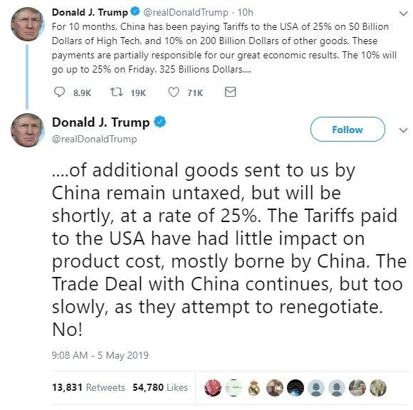"Thỏa thuận thương mại với Trung Quốc vẫn tiếp tục, nhưng quá chậm, bởi vì họ cố gắng đàm phán lại. Không!", ông Trump viết trên Tweeter. Ông Trump đổ lỗi cho Trung Quốc đang cố gắng tiến hành đàm phán lại.