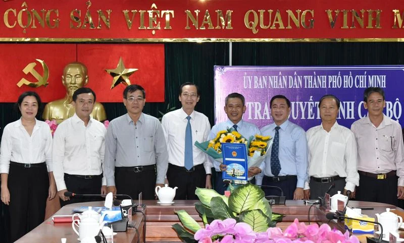Lãnh đạo TP.HCM tặng hoa chúc mừng ông Võ Văn Đức nhận nhiệm vụ mới. Ảnh: PHƯƠNG THÙY