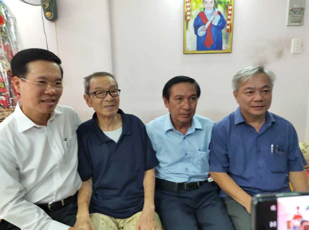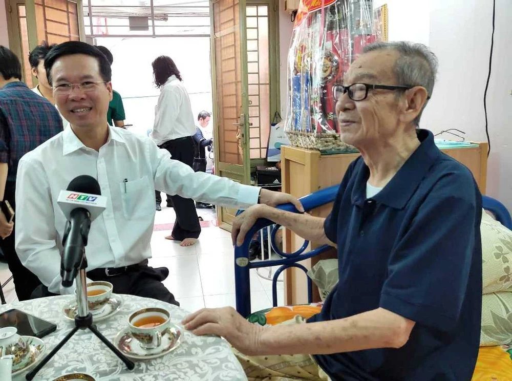 Ông Võ Văn Thưởng, Trưởng ban Tuyên giáo Trung ương, đến chúc tết gia đình NSND Đinh Bằng Phi. Ảnh: HÒA BÌNH