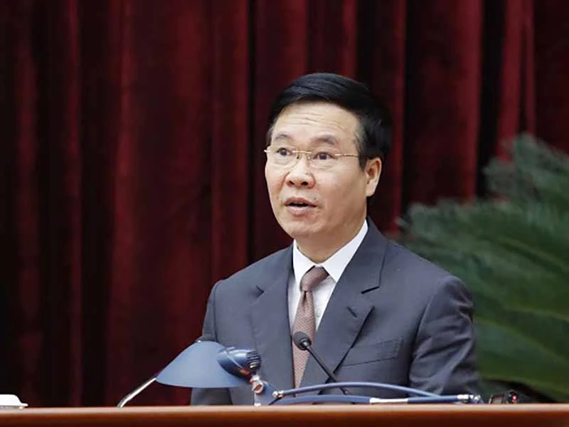 Ông Võ Văn Thưởng, Ủy viên Bộ Chính trị, Thường trực Ban Bí thư phát biểu tại Hội nghị toàn quốc tổng kết công tác kiểm tra, giám sát năm 2021