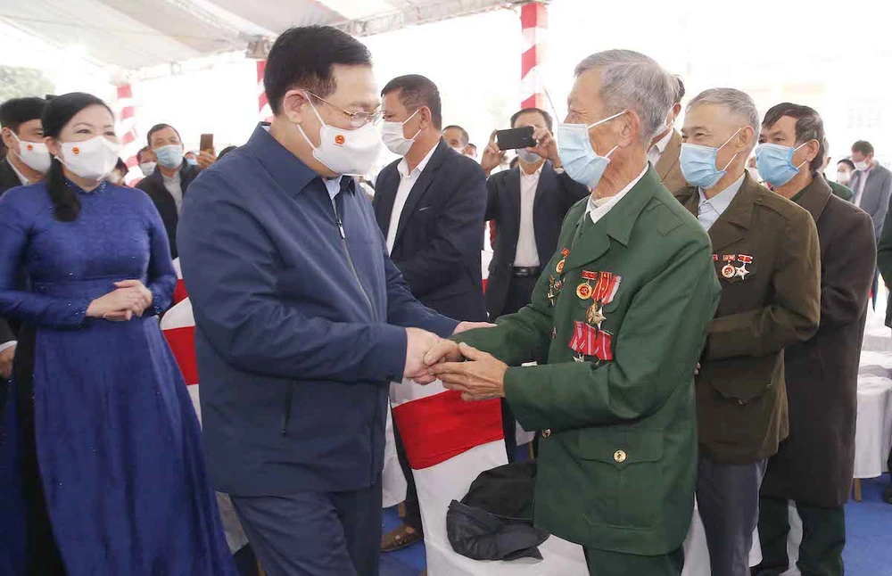 | Chủ tịch Quốc hội tăng nhà đoàn kết, quà cho hộ nghèo Chủ tịch Quốc hội Vương Đình Huệ và Đoàn công tác của Trung ương cũng đã trao tặng 2,5 tỉ đồng xây dựng 50 Nhà đại đoàn kết cho các hộ nghèo tỉnh Thái Nguyên; trao 50 suất quà tặng các hộ nghèo, hộ gia đình chính sách, người có công, tổ COVID cộng đồng và các khu dân cư xã Trung Lương. Tỉnh Thái Nguyên cũng trao tặng hai hộ nghèo kinh phí xây dựng Nhà đại đoàn kết và 31 máy tính bảng cho 31 học sinh theo chương trình “Sóng và máy tính cho em”. |