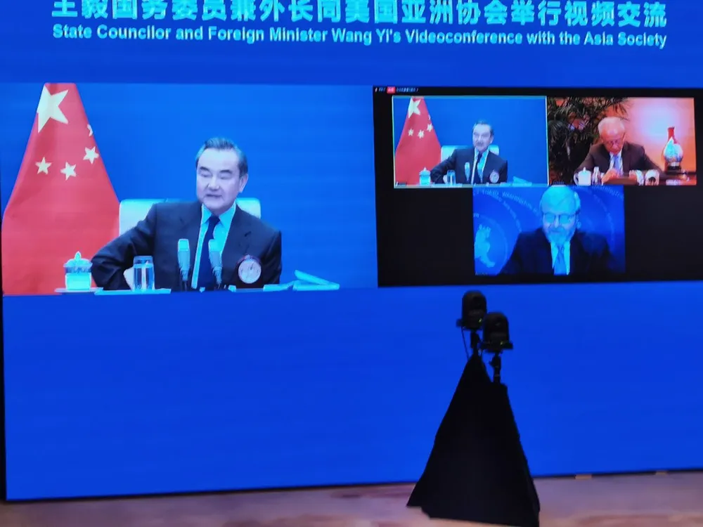 Bộ trưởng Ngoại giao Trung Quốc Vương Nghị phát biểu tại hội nghị của tổ chức giáo dục Asia Society (Mỹ) hôm 18-12. Ảnh: TWITTER