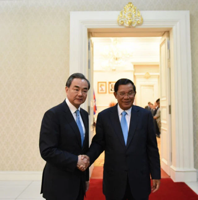 Thủ tướng Campuchia Hun Sen (phải) tiếp Bộ trưởng Ngoại giao Trung Quốc Vương Nghị thăm Phnompenh năm 2016. Ảnh: BỘ NGOẠI GIAO TRUNG QUỐC