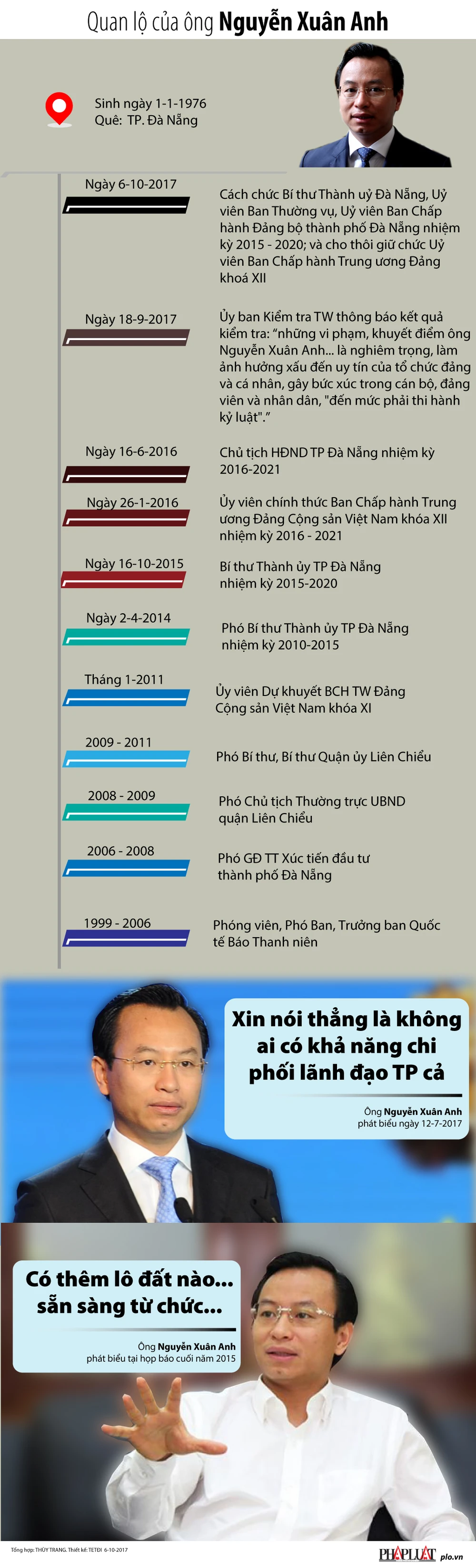 (PLO)- Sau khi thảo luận và cân nhắc nhiều mặt, Ban Chấp hành Trung ương Đảng đã quyết định thi hành kỷ luật đồng chí Nguyễn Xuân Anh, Uỷ viên Trung ương Đảng, Bí thư Thành uỷ Đà Nẵng bằng hình thức: Cách chức Bí thư Thành uỷ Đà Nẵng, Uỷ viên Ban Thường vụ, Uỷ viên Ban Chấp hành Đảng bộ thành phố Đà Nẵng nhiệm kỳ 2015 - 2020; và cho thôi giữ chức Uỷ viên Ban Chấp hành Trung ương Đảng khoá XII.