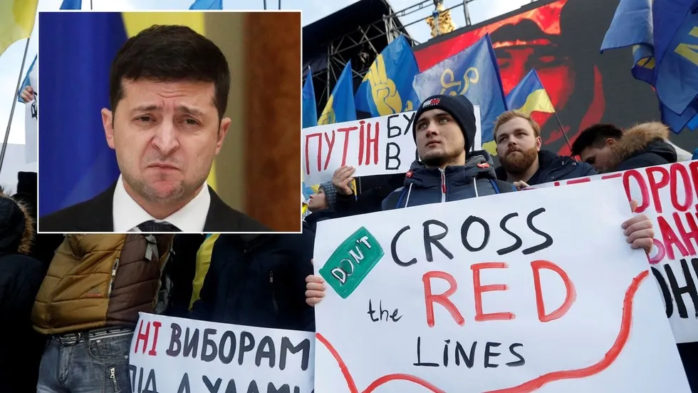 Người biểu tình Ukraine giơ bảng với dòng chữ "Đừng vượt lằn ranh đỏ". Ảnh: RT