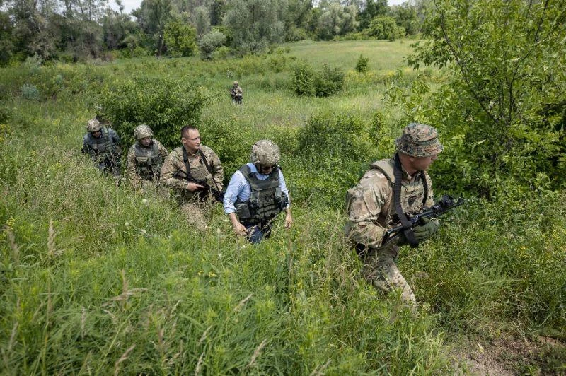 Tân Tổng thống Ukraine di chuyển với các quân nhân dọc các cánh đồng.