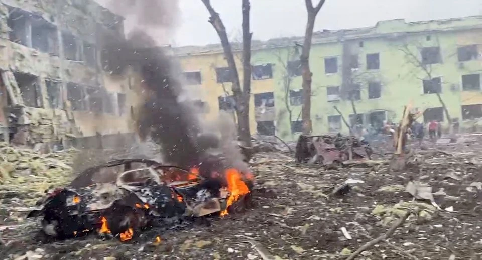 Một chiếc xe hơi bốc cháy hoàn toàn ở phía bên ngoài một bệnh viện nhi ở Mariupol sau khi bị Nga pháo kích vào ngày 9-3. Ảnh: REUTERS
