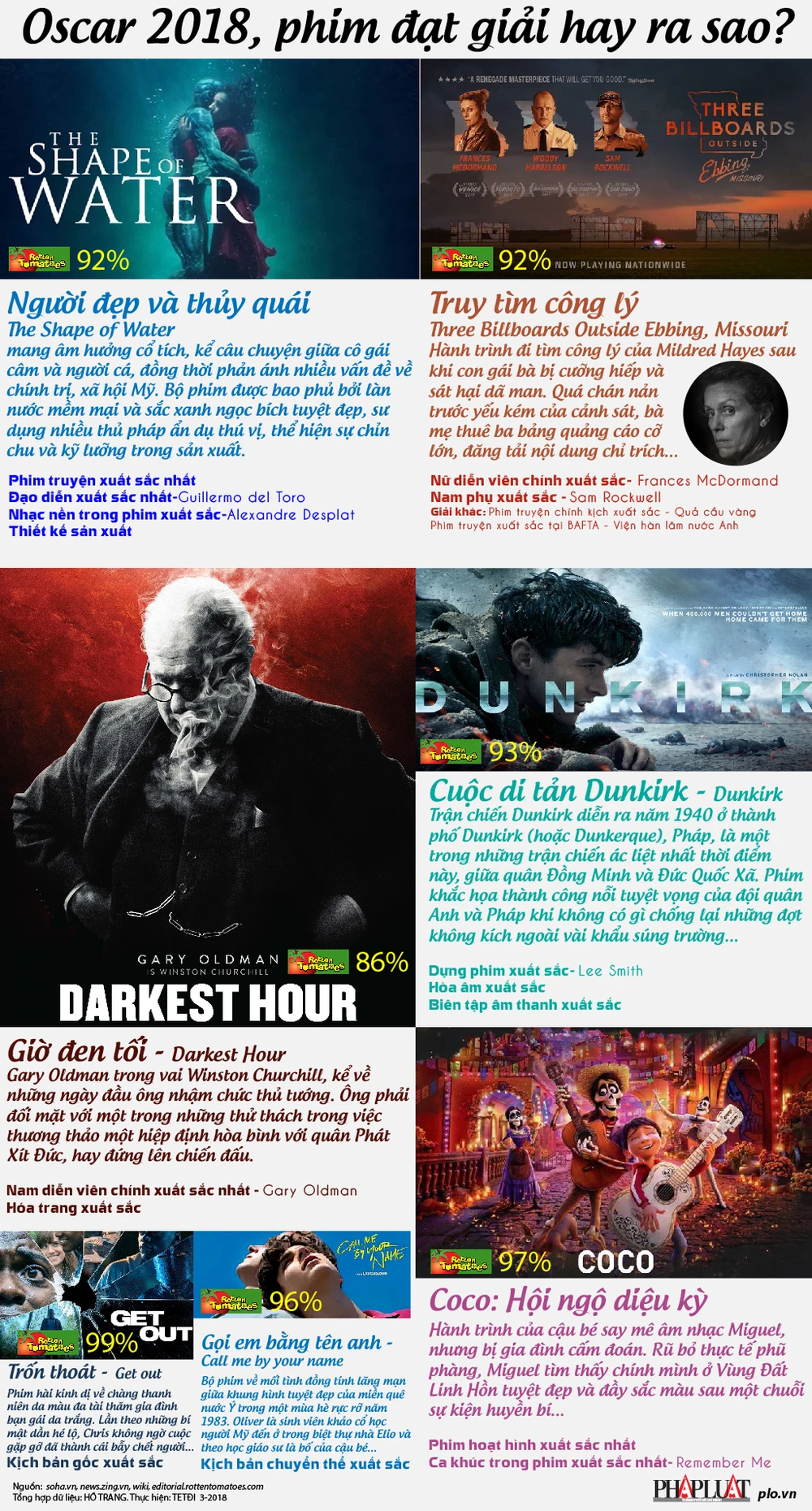 (PLO)- Giải Oscar 2018 đã có chủ. Dưới đây là nội dung sơ nét của những bộ phim nổi bật và đánh giá của nhiều nhà phê bình điện ảnh trên rottentomatoes.com.