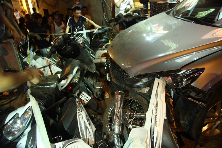 Tiếp đó, chiếc ô tô lao lên vỉa hè đâm đổ gần chục chiếc xe máy đang dựng ở bên đường khiến nhiều người đứng trên vỉa hè hoảng hốt.