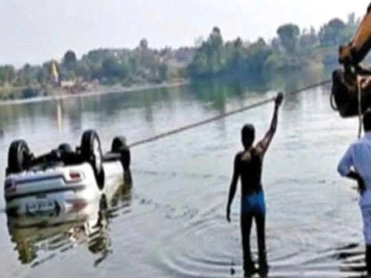 Chiếc xe bị chìm trong đập và được người dân kéo lên. Ảnh: Maharashtra Times