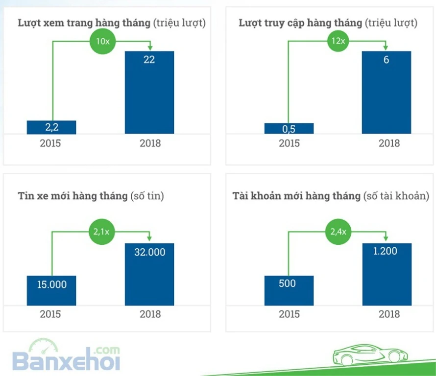 Cụ thể, năm 2018, Oto.com.vn sở hữu 22 triệu lượt xem trang hàng tháng, tăng hơn 10 lần so với năm 2015. Lượt truy cập hàng tháng cũng tăng trưởng gấp 12 lần đạt 6 triệu lượt.