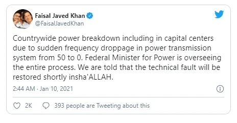 Theo thông báo của Bộ trưởng Năng lượng Pakistan Omar Ayub Khan, nguyên nhân vụ cúp điện trên là do trục trặc trong hệ thống truyền tải điện khiến tần số điện đột ngột giảm. Ông cho biết đang đích thân giám sát tình hình.