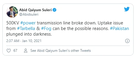 Ông Abib Qaiyum Suleri cho biết một đường dây tải điện 500 KV đã bị đứt. Ảnh: TWITTER