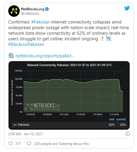 Hệ thống kết nối Internet của Pakistan đã giảm mạnh xuống còn 62% sau vụ mất điện toàn quốc. Ảnh: TWITTER