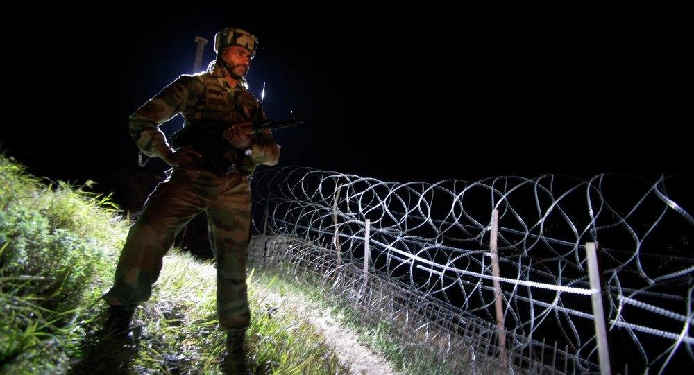 Một binh sĩ Ấn Độ canh gác gần hàng rào thép gai ở đường kiểm soát phân chia khu vực Kashmir. Ảnh: AP