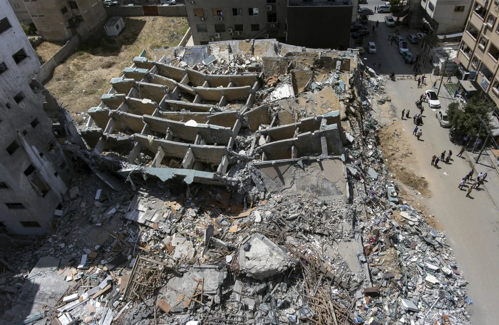 Một tòa nhà cao tầng bị phá hủy hoàn toàn trong cuộc không kích của Israel trong cuộc xung đột với Hamas hồi tháng 5. Ảnh: AP